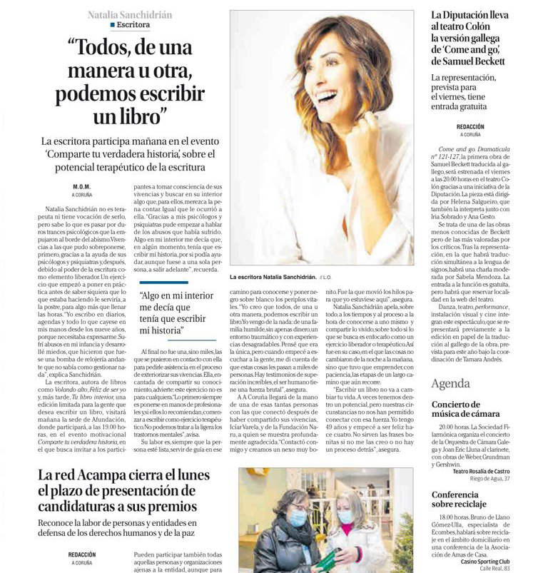 “Entender quién eres no es posible sin comprender quién fuiste, sin abordar un proceso de compasión y perdón al que se llega tras hablarte al oído. Esta comunicación requiere fortaleza y valentía, es un diálogo tan rico como descarnado al que te ayuda “Tu libro interior”. Toma la mano de su autora y empieza junto a ella, pues su luz va a acompañar cada uno de tus pasos durante esta nueva etapa de tu crecimiento personal. Haz como Natalia Sanchidrián, pon palabras a tu historia”.
